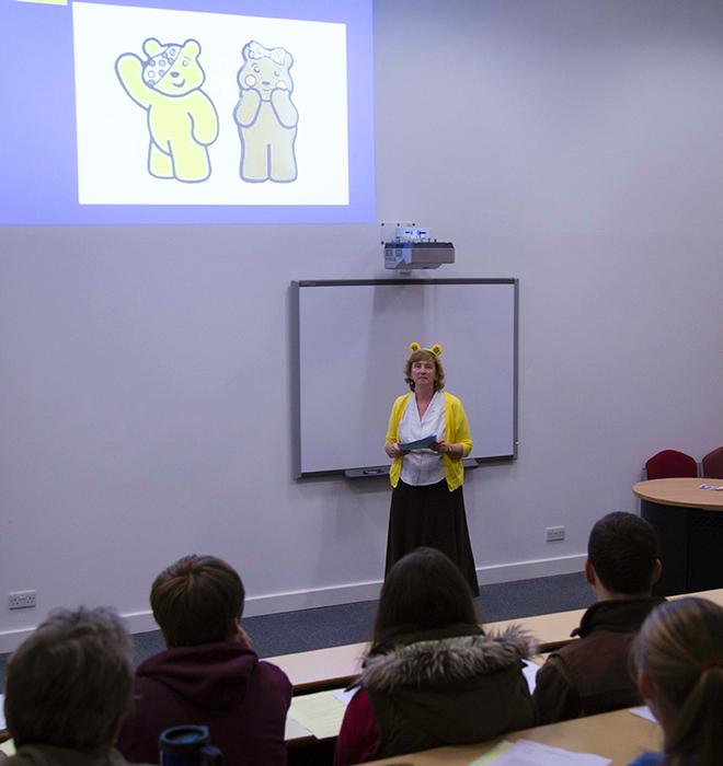 Nicky Hunter, Senior Lecturer in Ecology and Environmental Science, decided to wear a pair of Pudsey ears throughout her lecture on ‘intraspecific competition’, part of the Introduction to Ecology module studied by animal behaviour, animal welfare, countryside, environment and wildlife students.